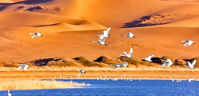 腾格里沙漠天鹅湖,沙漠、湖泊、飞鸟……
