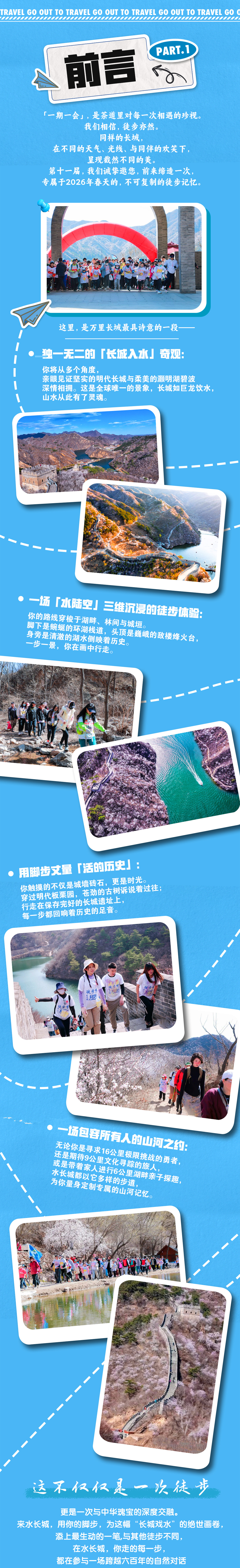 黄花城水长城是北京唯一的湖滨长城。它是长城徒步旅行的最佳目的地之一。游客还可以乘船从另一个角度欣赏黄花城长城。长城也是中国也是世界上修建时间最长、工程量最大的一项古代防御工程,自西周时期开始,延续不断修筑了2000多年,分布于中国北部和中部的广大土地上,总计长度达5万多千米。健康与自然息息相关,通过长城徒步+宿营体验,更亲近自然,了解世界文化遗产!